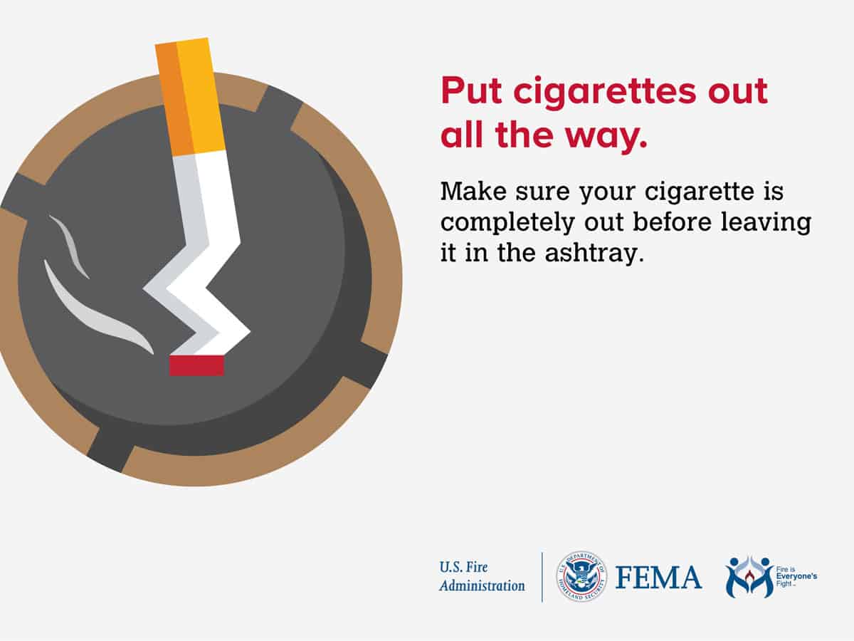 - Put cigarettes out all the way. Do this every time. Don’t walk away from lit cigarettes and other smoking materials. Put water on the ashes and butts to make sure they are really out before you put them in the trash.